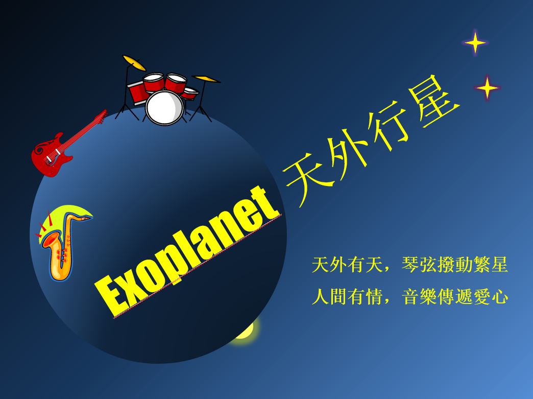 在遙遠的星空,也許有一顆像地球的行星,稱為天外行星。那裡有智慧生命,也可能有音樂。我們撥動琴弦,把我們的激情、創意和愛心,傳到遠方的繁星。