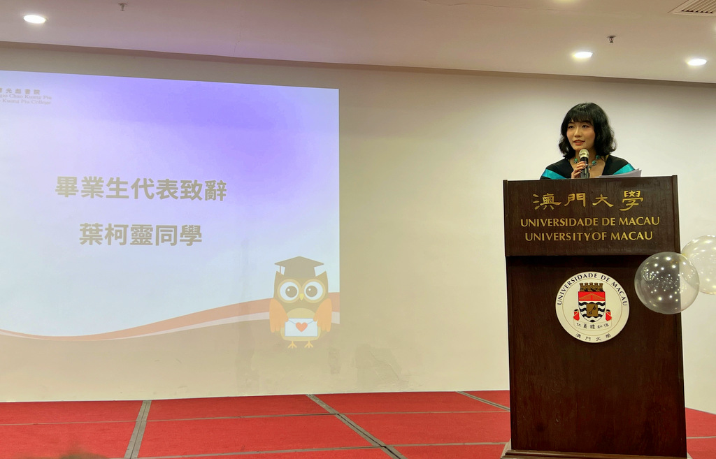 黎先生曾獲得2016-2017澳門廣東話四大演講比賽冠軍,和2017“我是演講家”全國大賽最佳演繹獎。他分享了他從一個害羞學生,逐步成長蛻變成演講藝術引領者的心路歷程。他勉勵畢業生不要受自身形象的約束,特別是不要讓各種流行標籤(如I型人、社恐等)阻擋自己,要勇於嘗試和挑戰,成就未來,發揮自己的潛能。