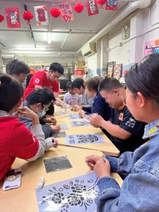 A day before the activity, the group members gathered for a rehearsal and prepared materials in advance, including gold leaf paper, black cardstock, pattern cards, and related tools. On the day of the event, as the children arrived, volunteers guided them step by step into the hands-on creation. In a relaxed and joyful atmosphere, mutual understanding and trust were quickly established between the volunteers and the children.