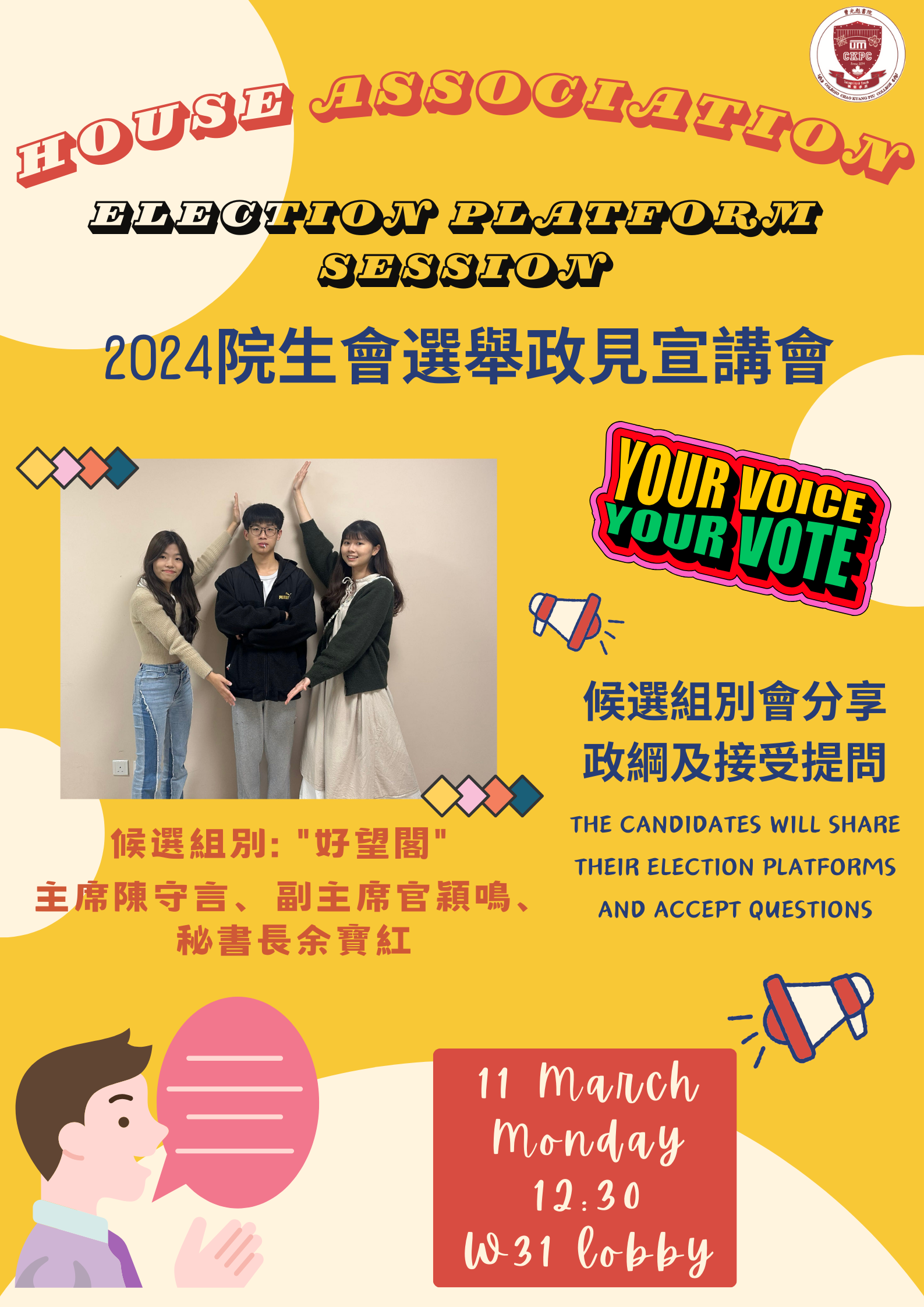 Lastly, according to the election schedule, online voting will take place from 10:00 a.m., March 12 (Thursday) to 5:00 p.m., March 13 (Friday). You will receive your token via college email on the morning of March 12. Please follow the instructions in the email to vote. Participation score counted for voting. Thank you once again for your involvement! Thank you!