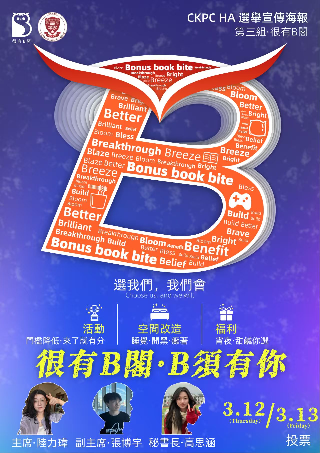 The campaign period will begin at 10:00 a.m. today, during which each group will conduct their publicity for approximately two weeks. Following this, we will hold the Candidate Policy Presentation Session on March 10 (Tuesday), from 12:45 to 13:30 at the Dining Hall. The three cabinets will share their platforms and ideas in order, and there will also be a Q&A session. Everyone is warmly welcome to participate and leave valuable feedback for the candidate groups.
